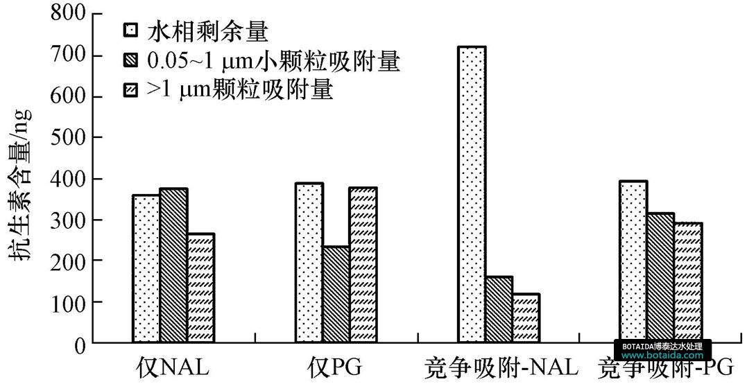 圖 1所示為萘啶酸(NAL)與青霉素G(PG)單獨(dú)存在及共同存在于水中的吸附實(shí)驗(yàn)結(jié)果.通過對(duì)比水相剩余量可知,當(dāng)萘啶酸和青霉素G同時(shí)存在時(shí),固體顆粒對(duì)青霉素G的吸附能力大于對(duì)萘啶酸的吸附能力.與抗生素單獨(dú)存在相比,萘啶酸的水相剩余量顯著增大,而青霉素G的水相剩余量則基本維持不變.可見,青霉素G的存在很大程度地抑制了顆粒對(duì)萘啶酸的吸附,但顆粒對(duì)其自身的吸附量影響甚微.這同時(shí)說明單一物質(zhì)存在時(shí),即使吸附達(dá)到平衡,顆粒上的吸附位點(diǎn)卻未飽和,顆粒的吸附能力并未達(dá)到最大.
