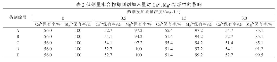 為驗(yàn)證低劑量水合物抑制劑對油田污水結(jié)垢性的影響,按表1 配制強(qiáng)結(jié)垢型的油田污水,并添加質(zhì)量分?jǐn)?shù)為0.5%~3%低劑量水合物抑制劑進(jìn)行試驗(yàn),結(jié)果見表2?試驗(yàn)表明,對于具有較強(qiáng)結(jié)垢趨勢的油田水質(zhì),加入水合物抑制劑后,Ca2+的保有率比空白稍有下降,但不顯著,即水合物抑制劑的加入對油田污水碳酸鈣垢的沉積不會造成太大的影響?除了E外, 隨著A~D 水合物抑制劑用量增加,Mg2+的保有率有不同程度的下降, 表現(xiàn)出對油田污水中Mg2+的沉積有一定的促進(jìn)作用?