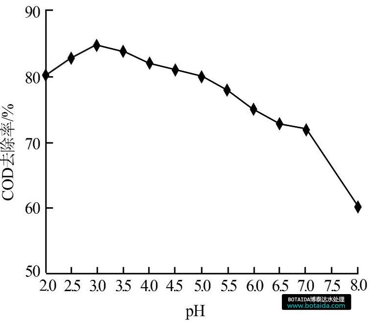 由圖4可以看出,在酸性條件下,隨pH的增加,廢水COD去除率增加,在pH=3.0時(shí)有最佳效果。當(dāng)pH小于3.0時(shí),鐵屑與酸反應(yīng)生成的氫氣大量覆蓋在鐵屑的表面,減小了鐵屑的有效表面積,降低了原電池效應(yīng),從而使處理效果下降。而且溶液pH過低,會(huì)破壞絮凝體,使溶液因Fe2++和Fe3++濃度增大而色度增加。當(dāng)pH大于3.0時(shí),H+濃度逐漸降低,陰極的反應(yīng)效果也下降。所以選擇適宜的進(jìn)水pH為3.0。