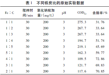 控制其他反應(yīng)條件不變,氯化鈉投加量為200 mg/L,pH值為3,攪拌時(shí)間為30 min,將鐵的投加量固定為20 g/L,在不同的鐵炭比(Fe∶C=5∶1、4∶1、3∶1、2∶1、1∶1、1∶2、1∶3、1∶4、1∶5) 條件下進(jìn)行反應(yīng)。測(cè)定各水樣CODCr值,計(jì)算CODCr的去除率,結(jié)果見表1。