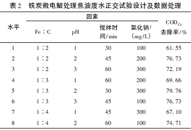 通過(guò)正交試驗(yàn),得到可以使CODCr去除率最高的最佳條件是: 鐵炭比為1∶3,pH值為2,氯化鈉投加量為200 mg/L,攪拌時(shí)間為45 min。在該條件下,焦油廢水的CODCr去除率最高,達(dá)到81. 26%。對(duì)于廢水的預(yù)處理來(lái)說(shuō),這樣的去除效果較為良好。