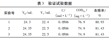 由正交試驗(yàn)的數(shù)據(jù)分析已知: 本實(shí)驗(yàn)的最佳條件為Fe∶C =1∶3,NaCl 的投加量為200 mg/L,pH為2,攪拌反應(yīng)時(shí)間為45 min。用該條件處理卷煙廠的焦油廢水,進(jìn)行三組平行實(shí)驗(yàn),測(cè)定這三個(gè)水樣的CODCr值,計(jì)算其去除率,從而驗(yàn)證該條件是否最佳。實(shí)驗(yàn)數(shù)據(jù)見表3。