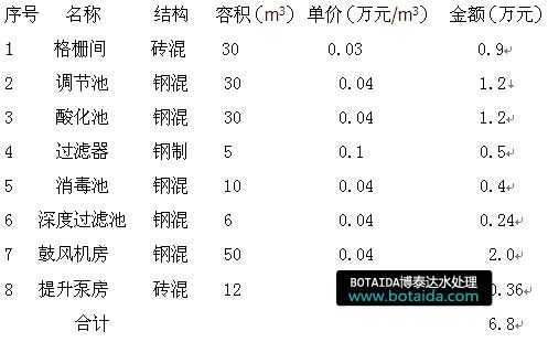 工程投資總額17.796萬元,按工程投資折合投資指標(biāo)為1483元/m3•d,而按有關(guān)行業(yè)標(biāo)準(zhǔn),或現(xiàn)有生活廢水一體化處理工程實(shí)踐,像這類高有機(jī)物濃度的廢水,投資指標(biāo)應(yīng)為4000~6000元/m3•d,這表明我們的工程投資指標(biāo)降低了3倍左右。