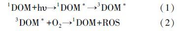 溶解性有機(jī)質(zhì)(DOM)含有發(fā)色基團(tuán),是重要的天然光敏劑,在紫外輻射或太陽光照射下,單線態(tài)(state DOM singlet,1DOM)分子吸收光能先轉(zhuǎn)化為激發(fā)單線態(tài)(excited state DOM singlet,1DOM*),進(jìn)而轉(zhuǎn)化為激發(fā)三線態(tài)(excited state DOM triplets,3DOM*),進(jìn)一步與溶解氧分子發(fā)生一系列反應(yīng),產(chǎn)生活性氧物質(zhì)(reactive oxygen species,ROS),如羥基自由基(hydroxyl radical,· OH)、單線態(tài)氧(singlet oxygen,1O2)、超氧化物(superoxide,O2-)等(見反應(yīng)式(1)、(2.這些活性氧物質(zhì)可以誘導(dǎo)有機(jī)污染物光降解,同時,DOM也會與目標(biāo)化合物競爭光吸收,或猝滅目標(biāo)化合物的激發(fā)態(tài),DOM對有機(jī)污染物的光解具有光敏化和光屏蔽雙重作用(Chen et al., 2009;,這與DOM的來源、組成、化學(xué)結(jié)構(gòu)等特點(diǎn)密切相關(guān).因此,溶解性有機(jī)質(zhì)在水生生態(tài)系統(tǒng)光化學(xué)中扮演重要角色,可以影響有機(jī)污染物的環(huán)境行為和生態(tài)風(fēng)險(xiǎn).