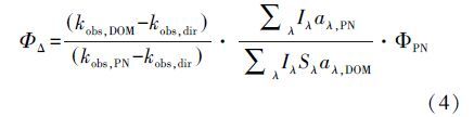 式中,Iλ表示光源在每個波長下的光照強(qiáng)度(W · m-2);aλ,DOM和aλ,PN分別表示腐殖酸和光敏劑在每個波長處的納氏吸收系數(shù)(m-1),可由公式(5)計(jì)算得到;Sλ是屏蔽因子,無量綱,可由公式(6)計(jì)算得到.