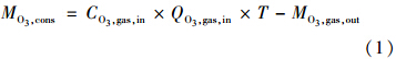 臭氧氣體濃度用碘量法測(cè)定.反應(yīng)結(jié)束后,用氮?dú)鈱⑾到y(tǒng)中殘留的臭氧吹出,并用1% KI溶液收集.實(shí)際消耗的臭氧由公式(1)計(jì)算.