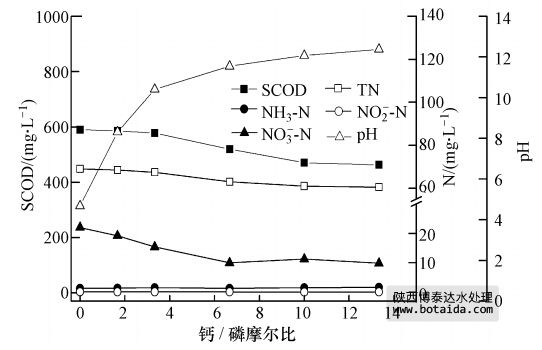圖 8 鈣磷比對(duì)除磷后污泥上清液SCOD、N和pH的影響
