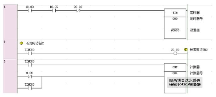 水處理系統(tǒng)所要達(dá)到的結(jié)果,這一段時(shí)間實(shí)現(xiàn)后,下面要實(shí)現(xiàn)的就是長(zhǎng)定時(shí)的方法2,設(shè)置常開點(diǎn)TIM000,在常開點(diǎn)TIM000后接上線圈2000,這一小段程序雖然在整個(gè)污