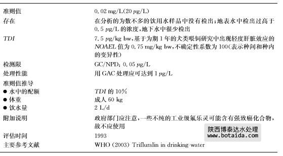氟樂靈(CASNo.1582 09 8)是一種用于多種農(nóng)作物的芽前除草劑。它水溶性低,與 土壤有很高的親和力。然而,生物降解和光降解過程可能生成能污染飲用水源的極性代謝 物。盡管氟樂靈在許多國(guó)家都有使用,但關(guān)于飲用水污染的數(shù)據(jù)相當(dāng)有限。