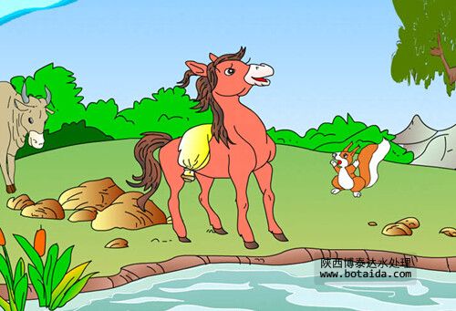 可是河上沒有橋,只能自己 淌過去??捎植恢篮铀卸嗌钅??猶豫中的小馬一抬頭,看見了正在不遠處吃草的牛伯 伯。小馬趕緊跑過去問到:“牛伯伯,您知道那河里的水深不深呀?” 牛伯伯挺起他那高大的身體笑著說:“不深,不深。才到我的小腿。”小馬高興地跑回 河邊準備淌過河去。