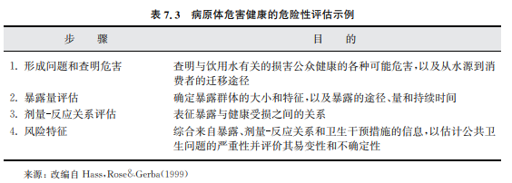 風(fēng)險(xiǎn)評(píng)估、包括QMRA,首先從提出問題開始,其目的是確定各種可能的危害及危 害從源頭到消費(fèi)者的各種遷移路徑。然后,將人接觸病原體的情況(環(huán)境濃度及攝入 量)和所選(或參考)生物體的劑量 反應(yīng)關(guān)系綜合起來以描繪出風(fēng)險(xiǎn)的特征。結(jié)合其他 信息(社會(huì)、文化、政治、經(jīng)濟(jì)、環(huán)境等)就可提出一些優(yōu)先選用的管理辦法。為鼓勵(lì)利 益相關(guān)各方的支持和參與,在處理過程的每一階段,都能做到透明并主動(dòng)溝通有關(guān)危險(xiǎn) 性的信息是非常重要的。表7.3給出了危險(xiǎn)性評(píng)估的一個(gè)例子并在下面進(jìn)行詳細(xì) 描述。