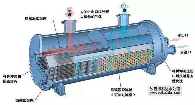 ② U形管式換熱器:它只有一塊管板,因此管子在受熱或冷卻時,可以自由伸縮。這種換熱器的結(jié)構(gòu)簡單,但制造彎管的工作量較大,且由于管子需要有一定的彎曲半徑,管板的利用率較差,管內(nèi)進(jìn)行機(jī)械清洗困難,拆換管子也不容易,因此要求通過管內(nèi)的流體是清潔的。這種換熱器可用于溫差變化大,高溫或高壓的場合。