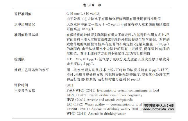 砷的實(shí)際定量極限是1~10μg/L,并且在許多情況下去除砷到達(dá)10μg/L以下的水平 非常困難。由于實(shí)際飲用水工藝中(尤其供水規(guī)模較小情況下)去除砷十分困難,以及定量 的檢測(cè)限水平較高,將10μg/L保留作為濃度控制目標(biāo)和暫行準(zhǔn)則值。