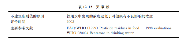 滅草松(CASNo.25057 89 0)是一種用于多種農(nóng)作物的廣譜除草劑。在土壤和水中 發(fā)生光降解作用,但在土壤中遷移性很強(qiáng),在環(huán)境中的持久性屬中等程度。曾有報(bào)道表明地 表水、地下水和飲用水中發(fā)現(xiàn)滅草松的濃度為數(shù)微克每升或更少。盡管滅草松在地下水中 存在并與水體有很高的親和性,但它在環(huán)境中似乎并沒有蓄積性。滅草松來自食物的暴露 量不會(huì)很高(見表12.12)。
