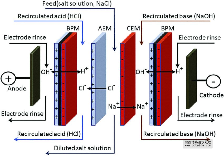 雙極膜是一種新型的離子交換復(fù)合膜,它通常由陽(yáng)離子交換層(N 型膜)、中間界面親水層(催化層) 和陰離子交換層(P 型膜) 復(fù)合而成,是真正意義上的反應(yīng)膜。中間界面層的厚度為納米級(jí),在直流電場(chǎng)作用下,中間界面層的水發(fā)生解離,在膜兩側(cè)分別得到氫離子和氫氧根離子。利用這一特點(diǎn) , 將雙極膜與其他陰陽(yáng)離子交換膜組合成的雙極膜電滲析系統(tǒng),能夠在不引入新組分的情況下將水溶液中的鹽轉(zhuǎn)化為對(duì)應(yīng)的酸和堿,這種方法稱為雙極膜電滲析法。雙極膜技術(shù)改變了傳統(tǒng)工業(yè)分離和制備過程,雙極膜電滲析法不僅用于制備酸和堿,若將其與單極膜巧妙地組合起來,在資源回收、化工生產(chǎn)和污染控制等方面均有廣泛應(yīng)用。