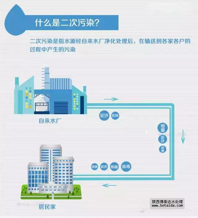 顧名思義,二次污染是指水源經(jīng)自來水廠凈化處理后,在輸送到各家各戶的過程中產(chǎn)生的污染。主要是一些水管老化出現(xiàn)的鐵銹、泥沙、細(xì)菌、病毒等雜質(zhì)和自來水廠氯制劑消毒后的副產(chǎn)物。二次污染的污染源主要有自來水管道、小區(qū)二次供水系統(tǒng)和水龍頭。