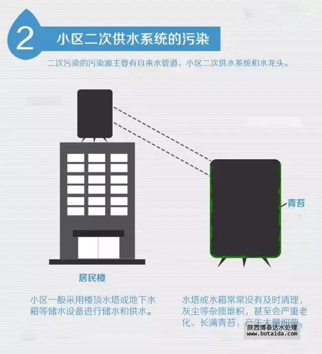 小區(qū)一般采用樓頂水塔或地下水箱等儲(chǔ)水設(shè)備進(jìn)行儲(chǔ)水和供水。而水塔或水箱常常沒有及時(shí)清理,灰塵等雜質(zhì)堆積。有的儲(chǔ)水設(shè)備甚至?xí)?yán)重老化、長(zhǎng)滿青苔,產(chǎn)生大量細(xì)菌滋生。