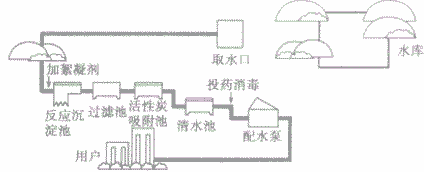 ⑤再將水引人活性炭吸附池中,除去水中的臭味和殘留的顆粒較小的不溶性雜質(zhì)。