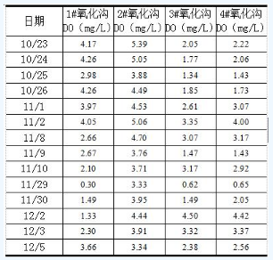 本項目于2017年9月底正式完成改造工程。其中1#、2#氧化溝采用了停水清池,底部安裝固定的方式,安裝了新的微孔曝氣器,3#、4#氧化溝采用了帶水作業(yè)的方式,安裝了新的旋流曝氣器。具體運(yùn)行數(shù)據(jù)見表2、 表3。