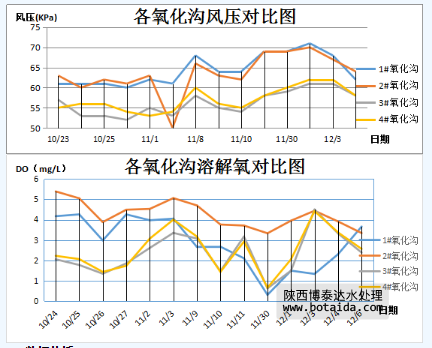 旋流曝氣器溶解氧上升原因分析:旋流曝氣器是通過帶水安裝的方式完成曝氣池改造工程的。在改造過程中,由于沒有停水清淤,故在3#、4#氧化溝內(nèi),其底部污泥含量較多。而微孔曝氣器是通過底部安裝的方式完成曝氣池改造工程的。在改造過程中,由于停水清淤,故在1#、2#氧化溝內(nèi),其底部污泥含量較少。