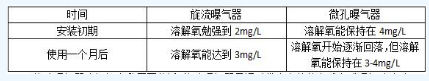 在溶解氧方面,在改造項目的使用初期,微孔曝氣器氧溶解氧更高,旋流曝氣器的溶解氧會隨著時間的延伸而升高直至穩(wěn)定。