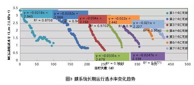 ① 透水率穩(wěn)定性透水率(J25/△P)是衡量膜滲透性能的主要指標(biāo)。以透水率隨運(yùn)行時(shí)間的衰減速率作為膜系統(tǒng)運(yùn)行穩(wěn)定性的評(píng)價(jià)指標(biāo),方法是:通過(guò)線性擬合分析得到每次維護(hù)性清洗(MC)后的起始透水率,再將每個(gè)恢復(fù)性清洗(RC)周期內(nèi)的起始透水率進(jìn)行線性回歸得到每個(gè)RC周期內(nèi)的透水率衰減速率,見(jiàn)圖3。