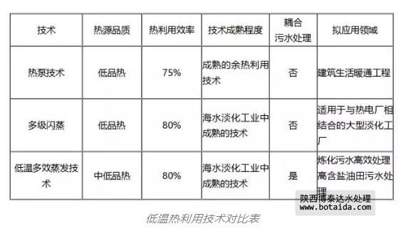 如低溫?zé)崂眉夹g(shù)對比表所示,較常規(guī)熱泵技術(shù)和多級閃蒸技術(shù),低溫多效蒸發(fā)在熱利用率、技術(shù)工藝耦合污水處理等方面具有明顯優(yōu)勢,代表了相關(guān)技術(shù)領(lǐng)域的發(fā)展方向,是開展余熱利用和污水處理耦合技術(shù)的重點(diǎn)方向。