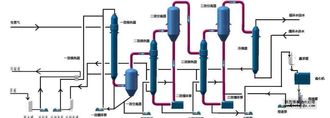 三效蒸發(fā):三效蒸發(fā)器由三組加熱器、三組分離器、預(yù)熱器、泵組、稠厚器、母液罐、離心機、電氣儀表控制及閥門、管路等組成。