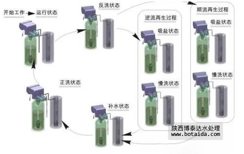 由于實際工作的需要, 軟化水設備的標準工作流程主要包括:工作(有時叫做產水)→反洗→吸鹽(再生)→慢沖洗(置換)→快沖洗五個過程。不同軟化水設備的所有工序非常接近,只是由于實際工藝的不同或控制的需要,可能會有一些附加的流程。任何以鈉離子交換為基礎的軟化水設備都是在這五個流程的基礎上發(fā)展來的(其中,全自動軟化水設備會增加鹽水重注過程)。